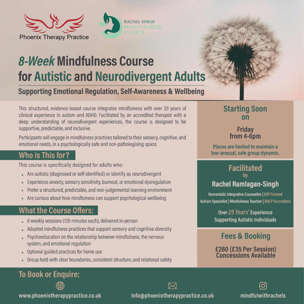 This structured, evidence-based course integrates mindfulness with over 20 years of clinical experience in autism and ADHD. Facilitated by an accredited therapist with a deep understanding of neurodivergent experiences, the course is designed to be supportive, predictable, and inclusive. Participants will engage in mindfulness practices tailored to their sensory, cognitive, and emotional needs, in a psychologically safe and non-pathologising space.